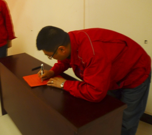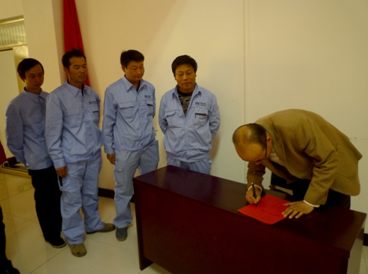 動員大會上各級領(lǐng)導(dǎo)、各車間管理干部、車間班組長上臺進行“百日安全大練兵”活動簽字儀式。